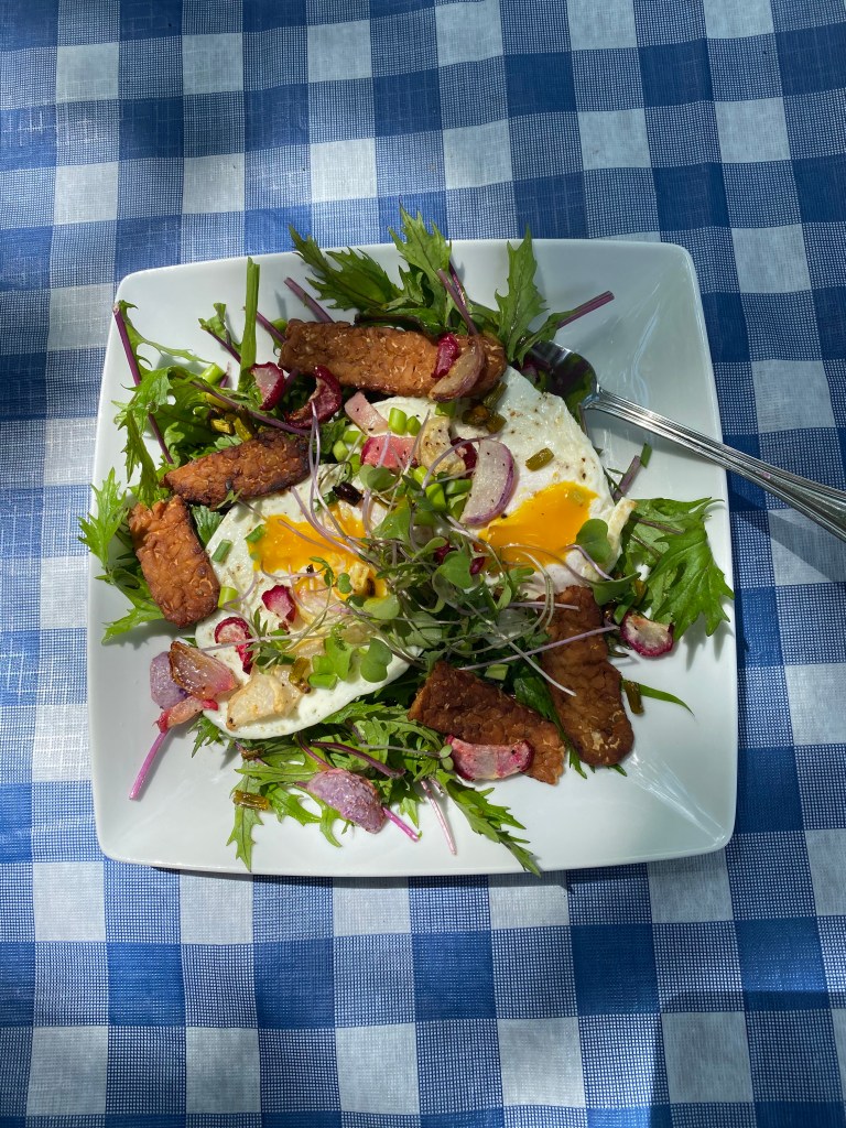 This is my fiancés’ creation when we starting getting a lot of greens from our CSA. To keep our impact low we excluded meat from the salad and replaced it with tempeh bacon. Additionally we buy our eggs local, reducing our overall impact rather than buying from a large agricultural grower. That combined with our CSA makes our overall impact low, but not zero. Naturally we almost always compost the scraps. Let me know how you like it!